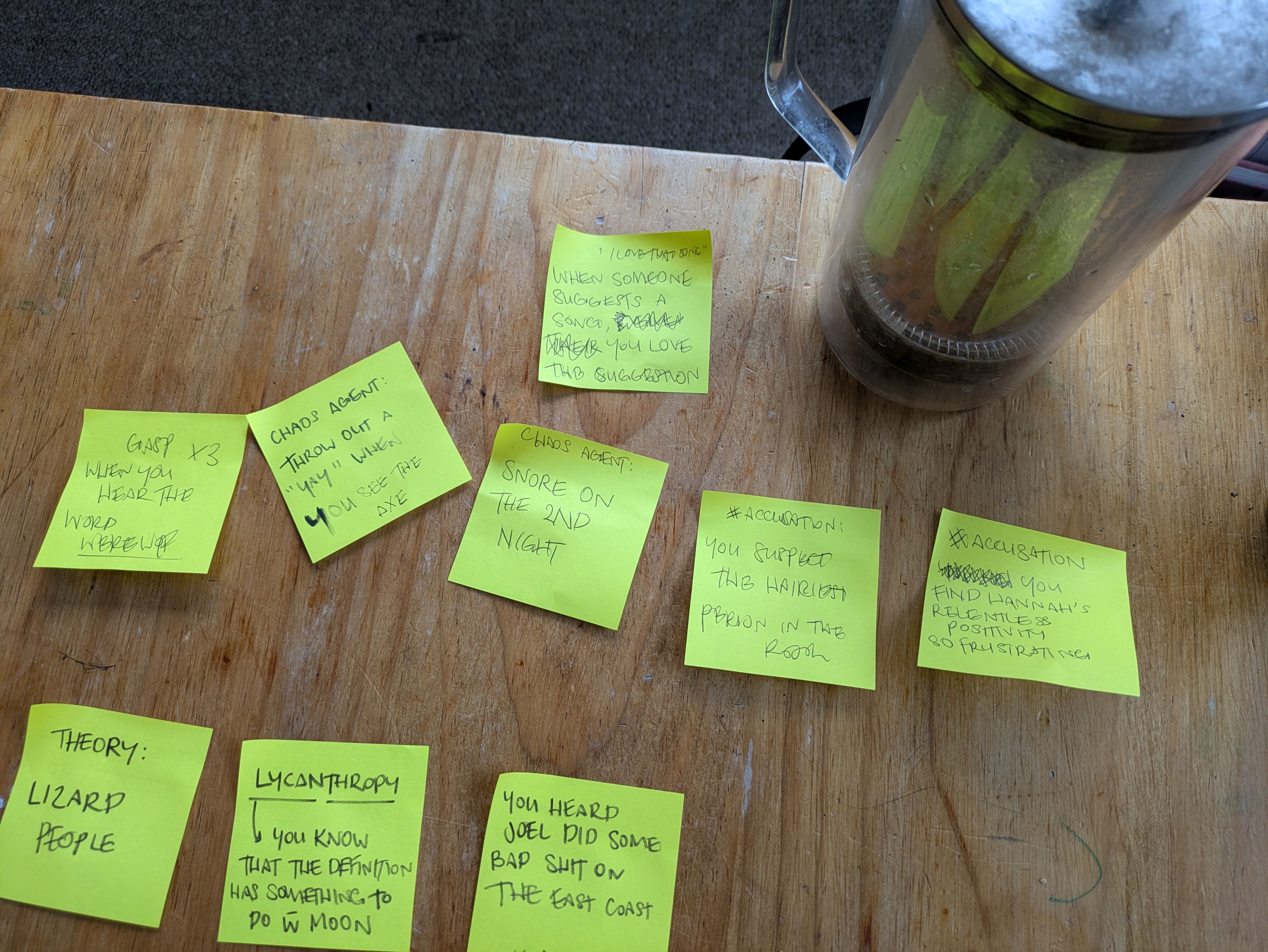 Brainstorming new audience cards for Werewolf. When we expanded the scale of the show recently, we needed lots more for the audience to do. One or two of these made it through - the gaspers being probably the most fun).