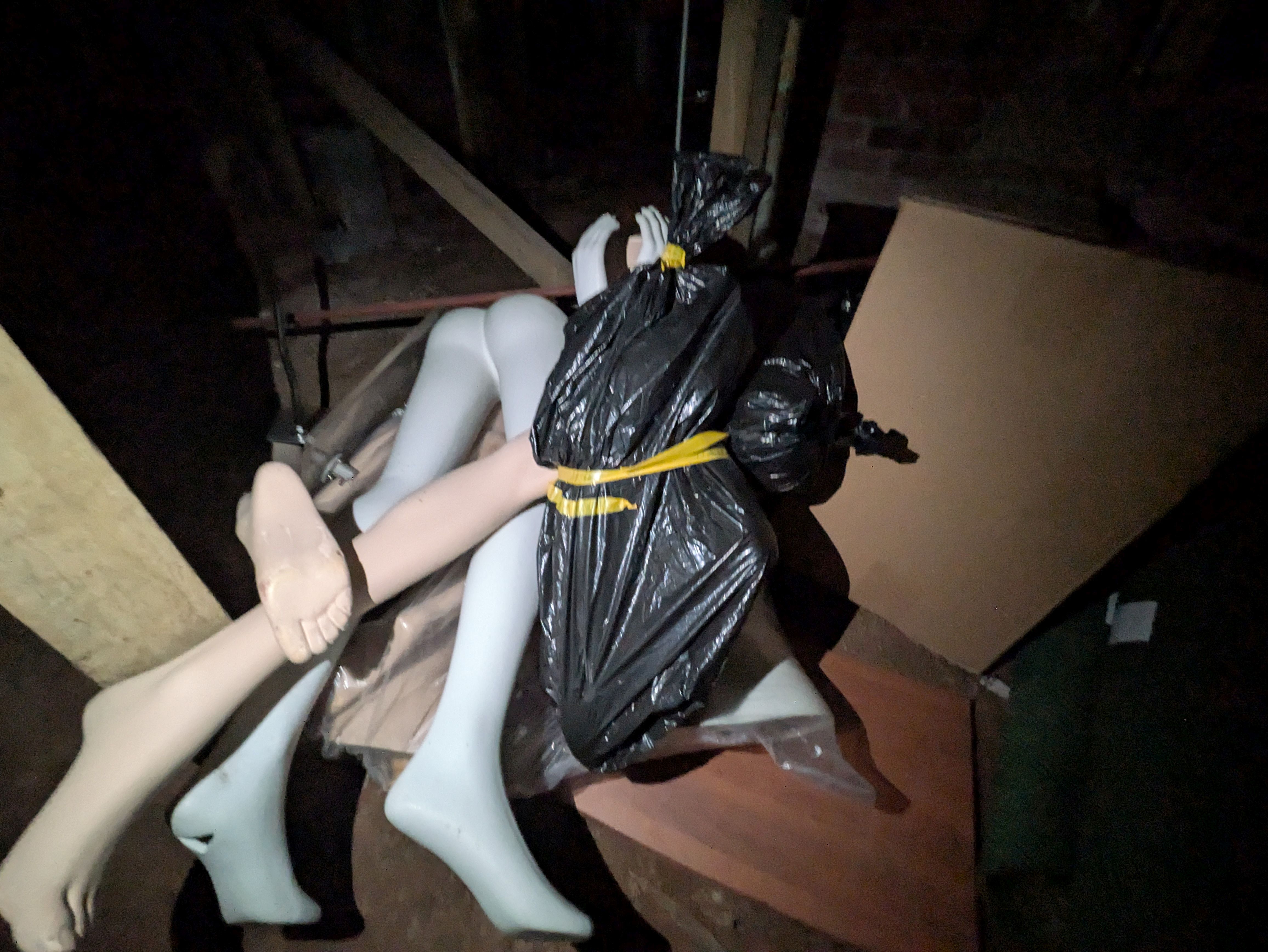 Not a crime scene, but a photo taken clearing out the storage under Joel's house. Will we ever use these legs and arms again? Who knows. It's always challenging deciding how much of your company's junk to hang on to, especially when you're relying on people's subfloor crawl spaces.