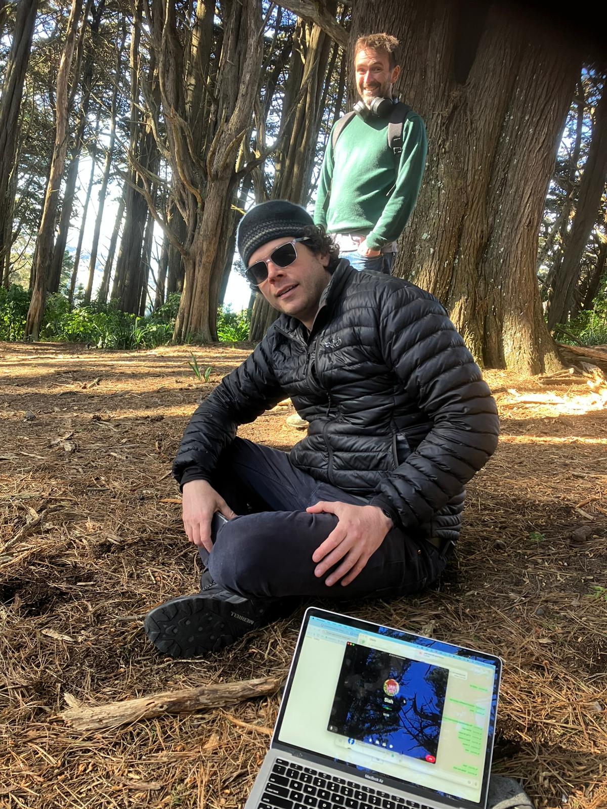 It's a strange thing to be out in the woods with a laptop, making real-time software updates with someone in another time zone. (Also, Siah's partner thought Joel was a ghost in this shot.)